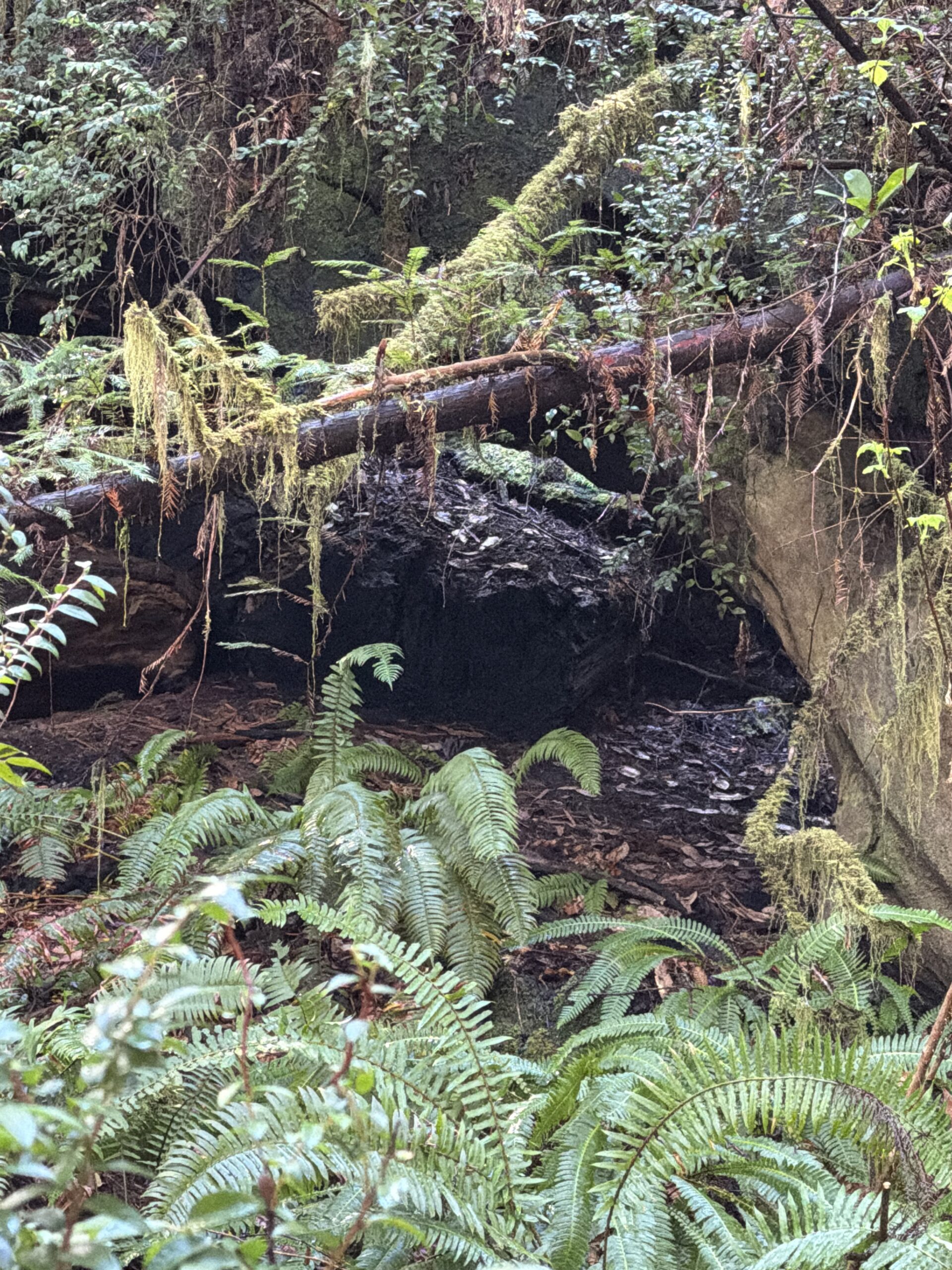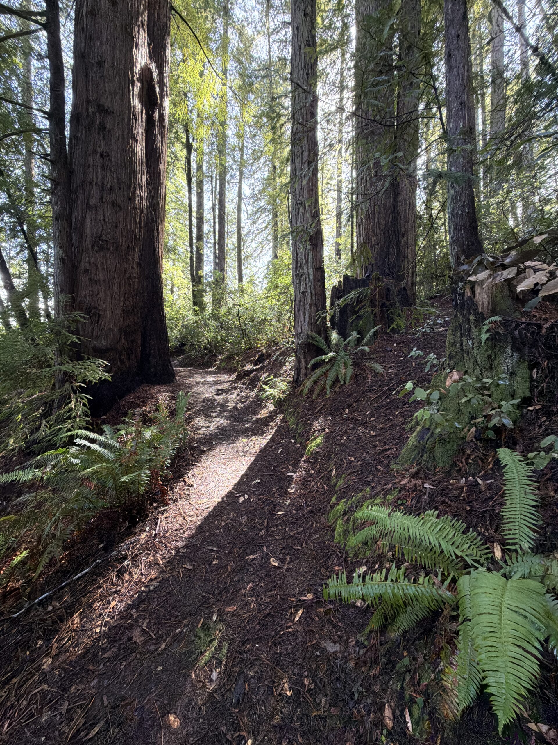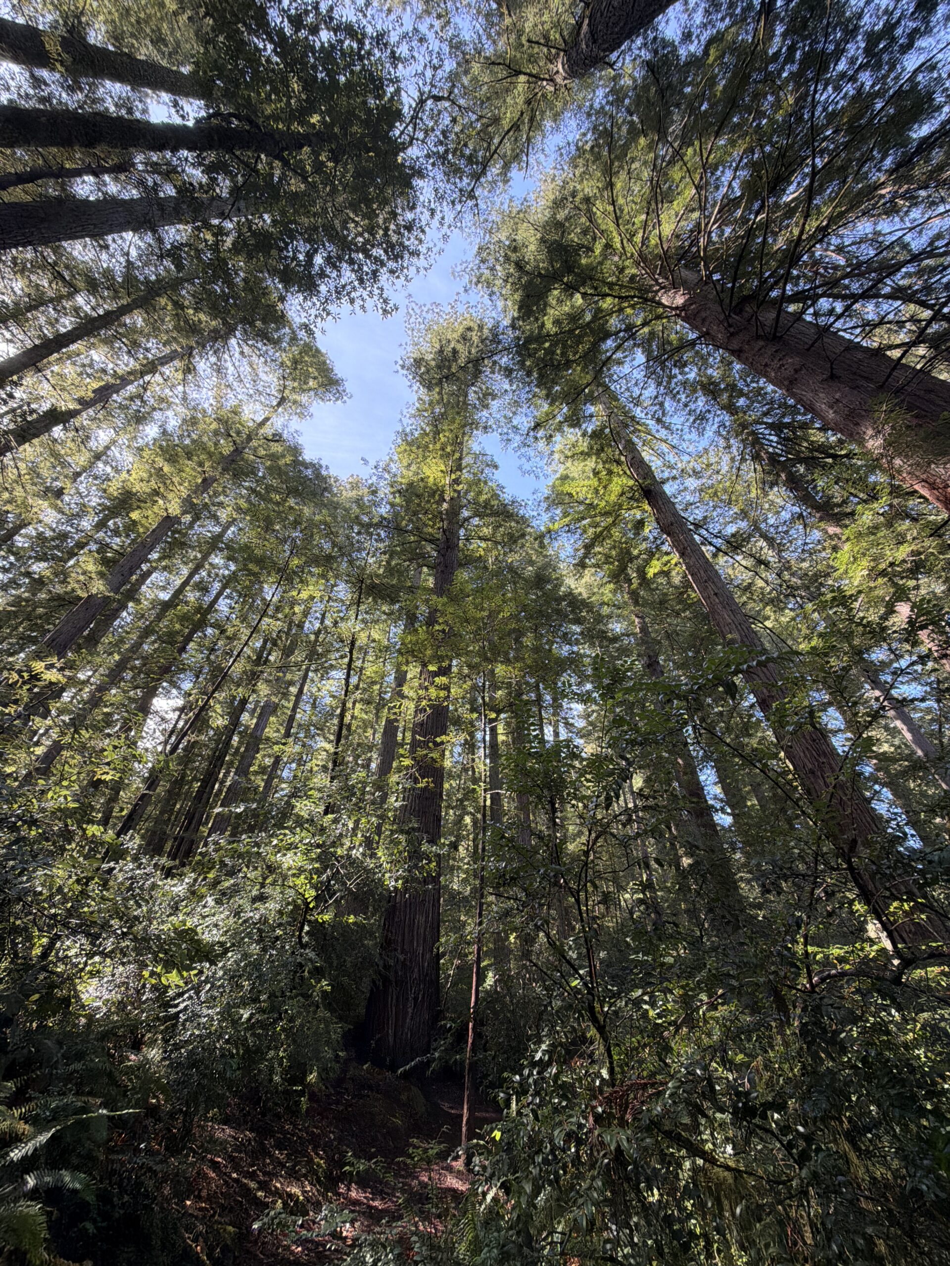 Redwood forests have a particular quality that’s hard to put into words without sounding like you’re exaggerating. The scale is just wrong — in the best possible way. You’re used to trees being a certain size, and these trees break that reference entirely. The trunks are wider than some living rooms. The bark is thick and fibrous and warm to the touch in a way you don’t expect. The afternoon light filters down through the canopy in shafts, catching dust and pollen in the air, and everything at ground level is lit by what gets through — a soft diffused green that makes the whole forest feel like it’s glowing from the inside. It’s the kind of light that makes your phone camera useless and forces you to just stand there and look. The River Below, the Trees Above