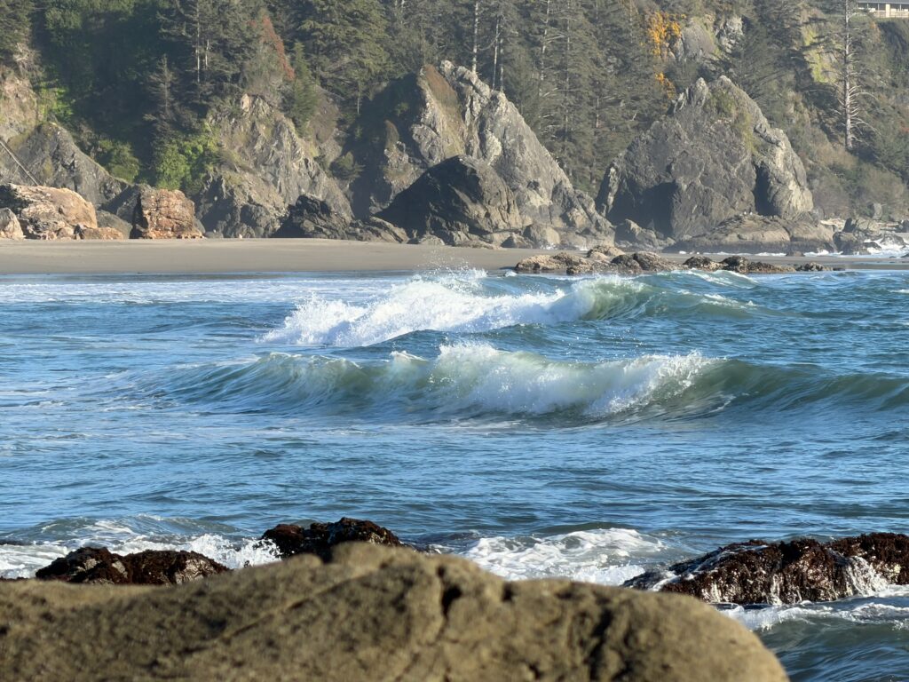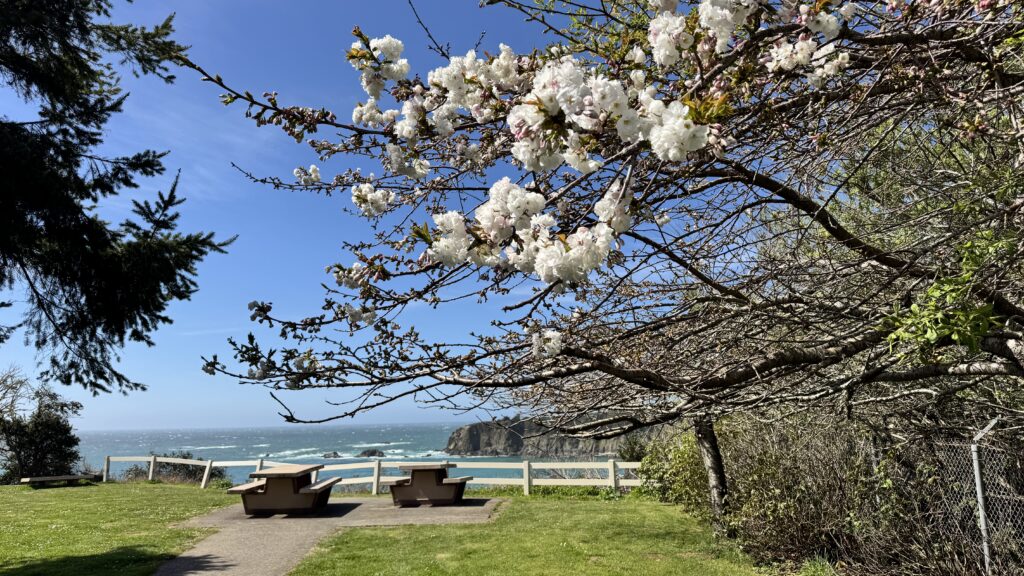 Winter on the Pacific is dramatic — grey swells, dark water, spray on the windows. Beautiful in its own way, but unrelenting. Spring changes that. As the storms ease and the sun climbs higher, the ocean shifts. The grey gives way first to a deep slate blue, then to the blue-green the coast is known for, and on the clearest spring days the water off Harris Beach can take on a colour that looks almost Caribbean — a shock of turquoise you don’t expect this far north.